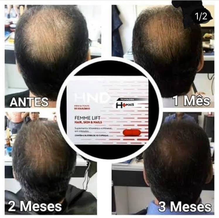 Suplemento alimentar de vitaminas e minerais em cápsula. Femme Lift Hair Skin & Nail contém vitamina A e C, vitaminas do complexo B e Selênio